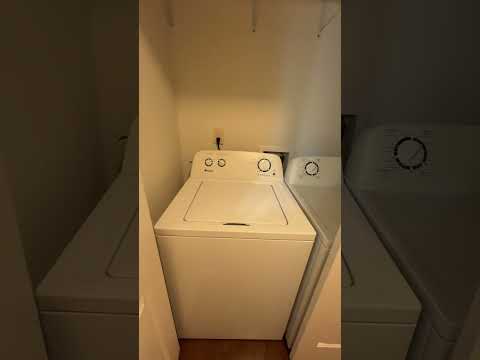 This apartment features an open-concept layout with walk-out patio doors. It comes equipped with a fridge, stove, microwave, dishwasher, and an in-unit washer and dryer.